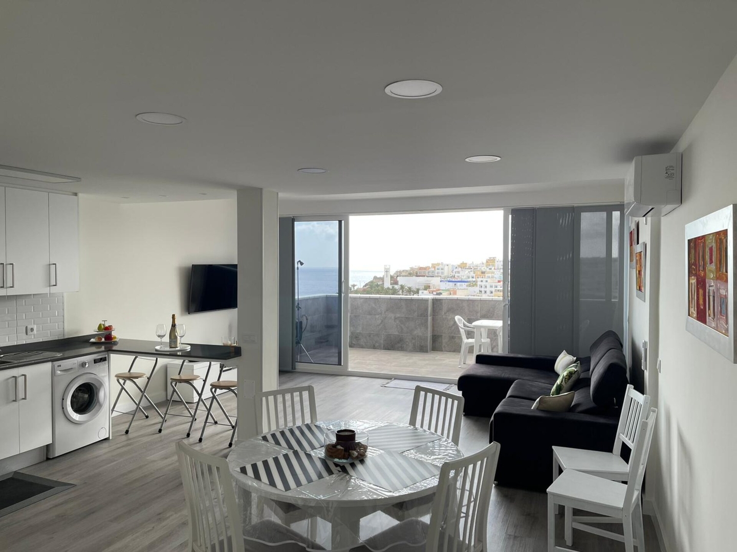 Apartamento amplio y diáfano donde se integra la cocina totalmente equipada y lavadora , zona comedor y salon TV plana , dando paso a una terraza con vistas al mar y ciudad.